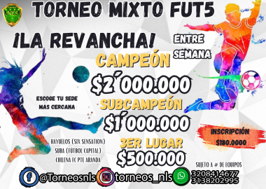🔰TORNEO MIXTO CHÍA FUT5 NLS 🔰 🏟SEDE CHÍA / LUNASPORT 🗓JUEGA SÁBADO O DOMINGOS O ENTRE SEMANA (LUNES-MARTES) ⚽TORNEO AFICIONADO-SIN PROFESIONALES 🤑INCREÍBLES PREMIACIONES 💰 EN EFECTIVO Y DE...